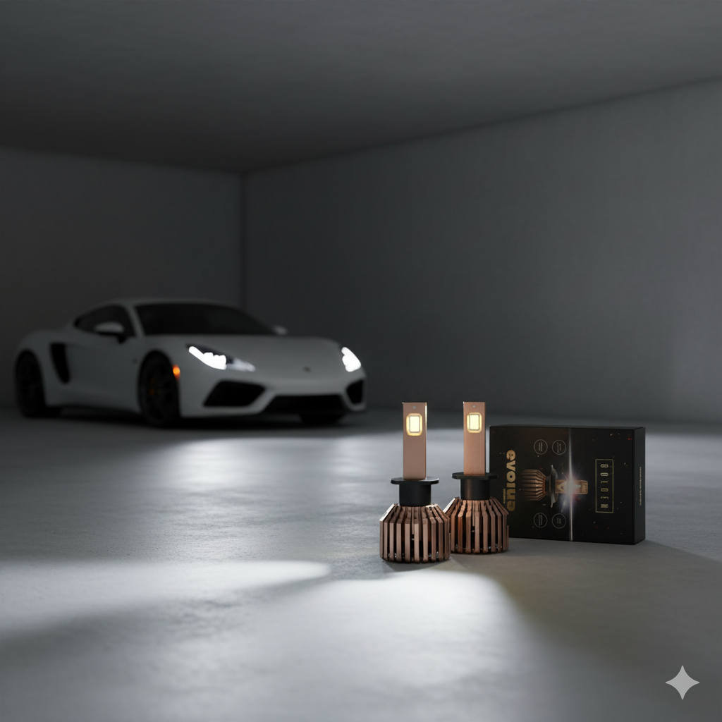 Nuestro Kit de LED EVOLUM es fabricado con una estructura de aluminio con difusor y ventilador turbo para su enfriamiento, garantiza la temperatura óptima con el objetivo de mantener la mayor durabilidad del LED, su tecnología LED tipo COB o CSP de alta potencia con visibilidad 360 (con luz centrada para mayor alcance de hasta un 300% ), además cuenta con un balastro para aumentar la potencia y regular los picos de voltaje.